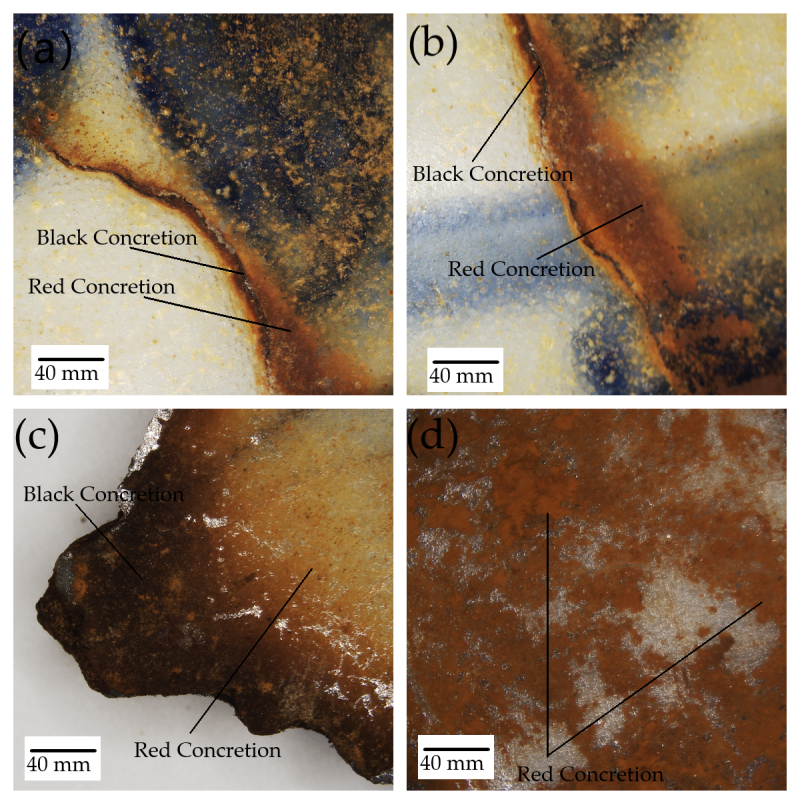 研究发现,这些铁质病害主要分布在瓷器表面的点蚀坑、裂缝等缺陷区域。铁质病害的主要成分是针铁矿、赤铁矿和纤铁矿,表观形貌(颜色、粗糙度等)的不同很可能与这些成分的比例变化有关。此外,铁质病害中还含有一些硫化亚铁、碳酸钙等海洋生物活动的产物。